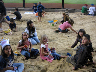 We spent Sunday with the Rices. We went with them to their ward which was very nice. My girls LOVED going to primary with Tristan! Afterwards, we went to their trailer back on the farm. It was exciting to be greeted by all of their animals! They have a lot more goats and chickens than they did the last time we came to visit. The kids all had a blast playing together. They played on this motorized thing, the new swingset, and waded in the pool. It was HOT!!